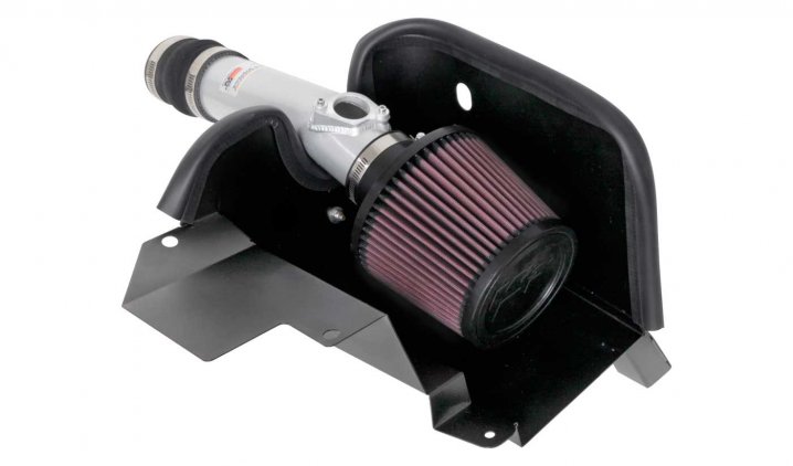 The K&N Typhoon air intake system is a free-flowing, mandrel-bent aluminum tube air induction system. The restrictive factory air filter and air intake housing are replaced by the K&N Typhoon air intake which is designed to dramatically reduce air flow restriction as it smoothes and straightens air flow. This allows your engine to inhale a larger amount of air than the factory air intake. More air means more usable power and acceleration throughout the engine’s RPM range. The air intake comes with a black rubber topped K&N high-flow air filter and a heat shield that installs into the previous air box space. Air is directed through the intake tube into the engine’s throttle body for a guaranteed power gain. The intake tube has an attractive silver powder-coat finish that's made to last and it accommodates the factory mass air sensor and crank case vent hose. The oversized cone shaped air filter can be used for up to 100,000 miles before servicing is needed depending on driving conditions. This air intake is relatively easy to install usually in 90 minutes or less.