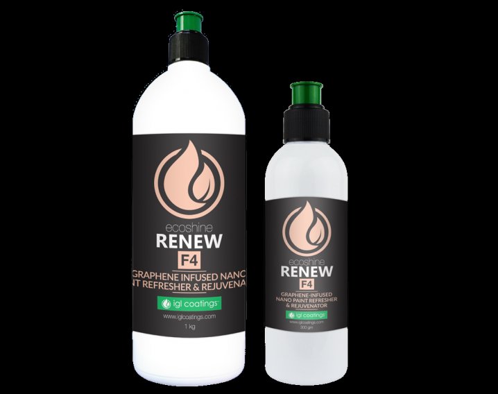 Ecoshine renew F4 is a graphene infused nano solution that refreshes and rejuvenates paintwork in just 1 step. It refreshes painted surface and cleans with ease. It also seals micro-marrings with a finish that resists heat, shrinkage and frost. ecoshine renew F4 is an abrasive free system powered by graphene that improves hydrophobicity, rejuvenates faded paint and increases the smoothness of the paint.