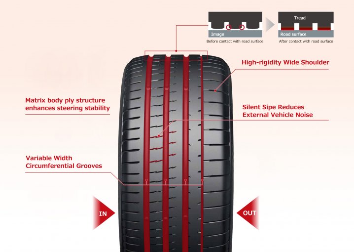 IN - Wide straight grooves enable enhanced drainage performance. Displays exceptional hydroplaning resistance at high speeds.