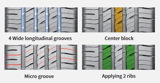 - Wave and Straight Grooves optimises the flow of water and improves hydroplaning performance