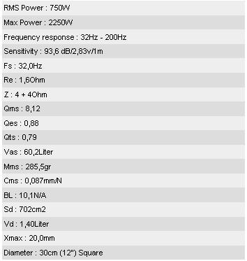 Subwoofer 30cm 750W dual 4 Ohm.