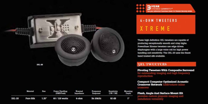 Offered in two distinct models, these high definition tweeters are capable of producing exceptionally smooth and crisp highs. PowerBass Xtreme tweeters use edge driven diaphragms with a large voice coil for high power handling and sensitivity. The 3XL-2S uses the finest hand treated silk available while the 2XL-1T incorporates an advanced anodised titanium dome.